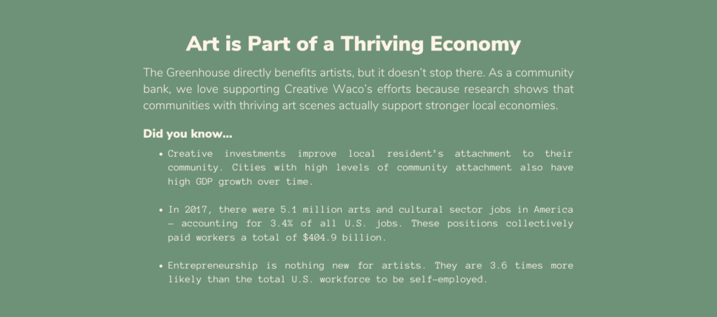 Collaborating with Creative Waco, our TFNB team was excited to help craft some of the financial management curriculum in the program. The finance-focused lessons help artists understand the challenges and opportunities of running a profitable business.