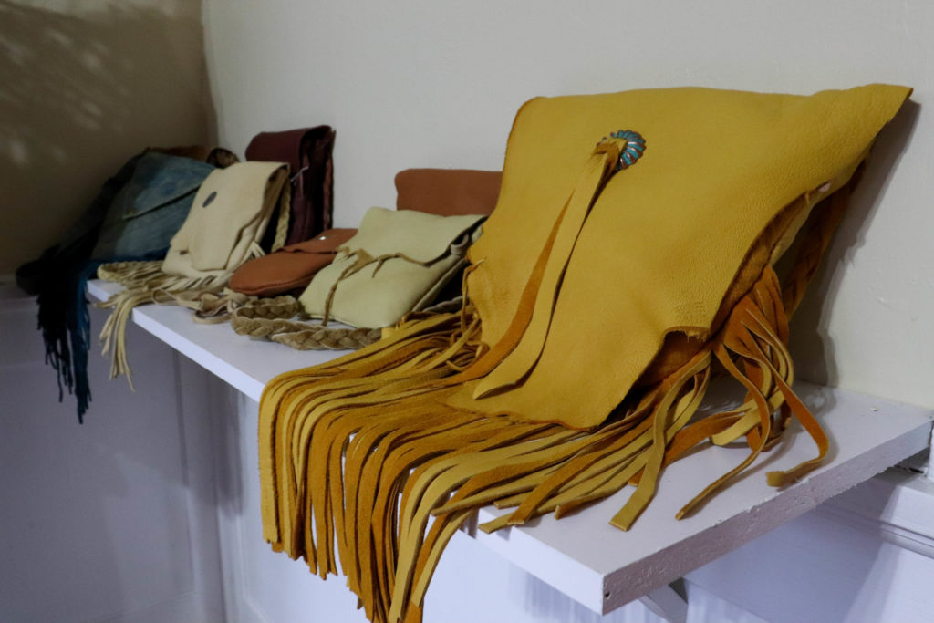 To the right of the main gallery, there is a small room that has been converted into a boutique/work space. The cozy room has one window, which faces the doorway and illuminates the details in beaded necklaces, colorful tunics and Kieran’s handmade leather bags. This space is the home of Kieran and Sistrunk’s Wandering Artisians Boutique. Even in the rainiest days, this vibrant room exudes feelings of awe and joy for those passing by.